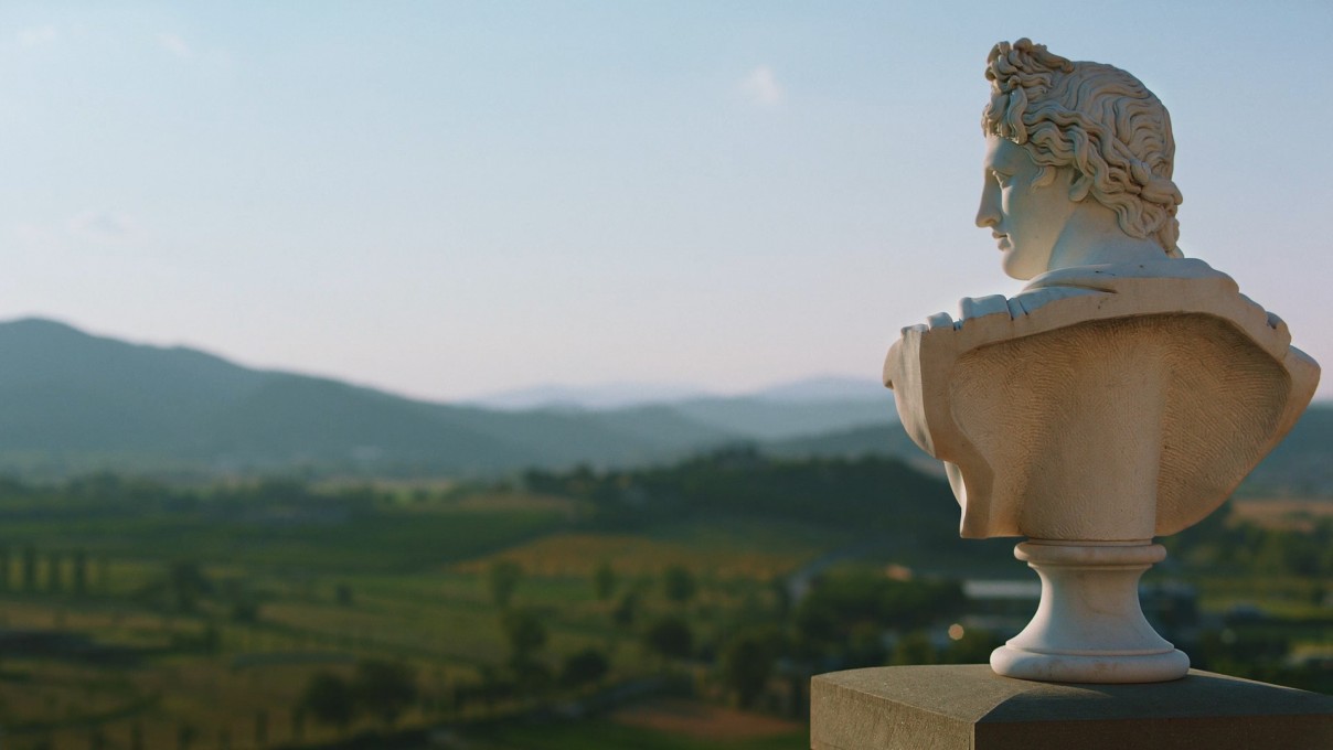 Davanti alla facciata della costruzione in pietra, ben visibile da ogni angolo della campagna e del borgo, si eleva la statua di Bacco a testimoniare la matrice greca del rapporto che lega l’uomo alla terra e ai suoi frutti.