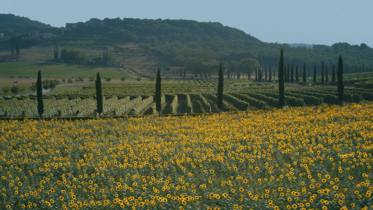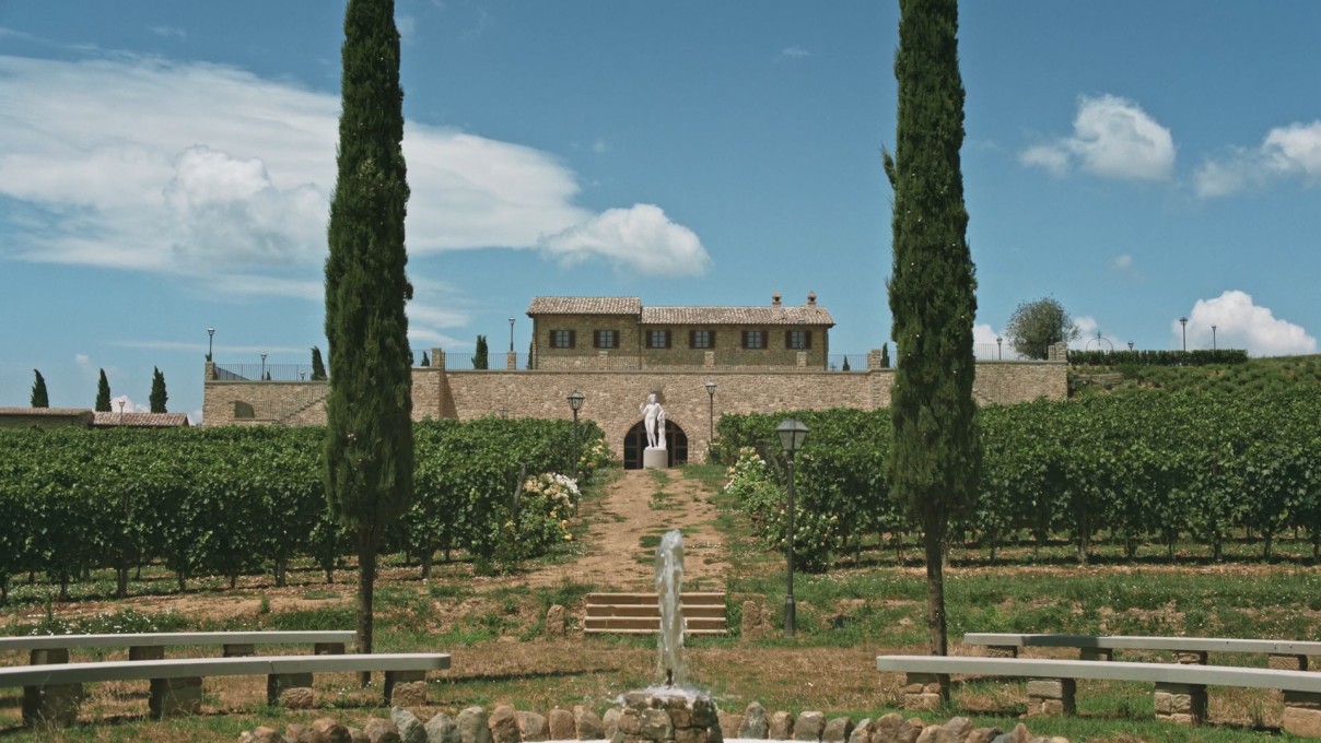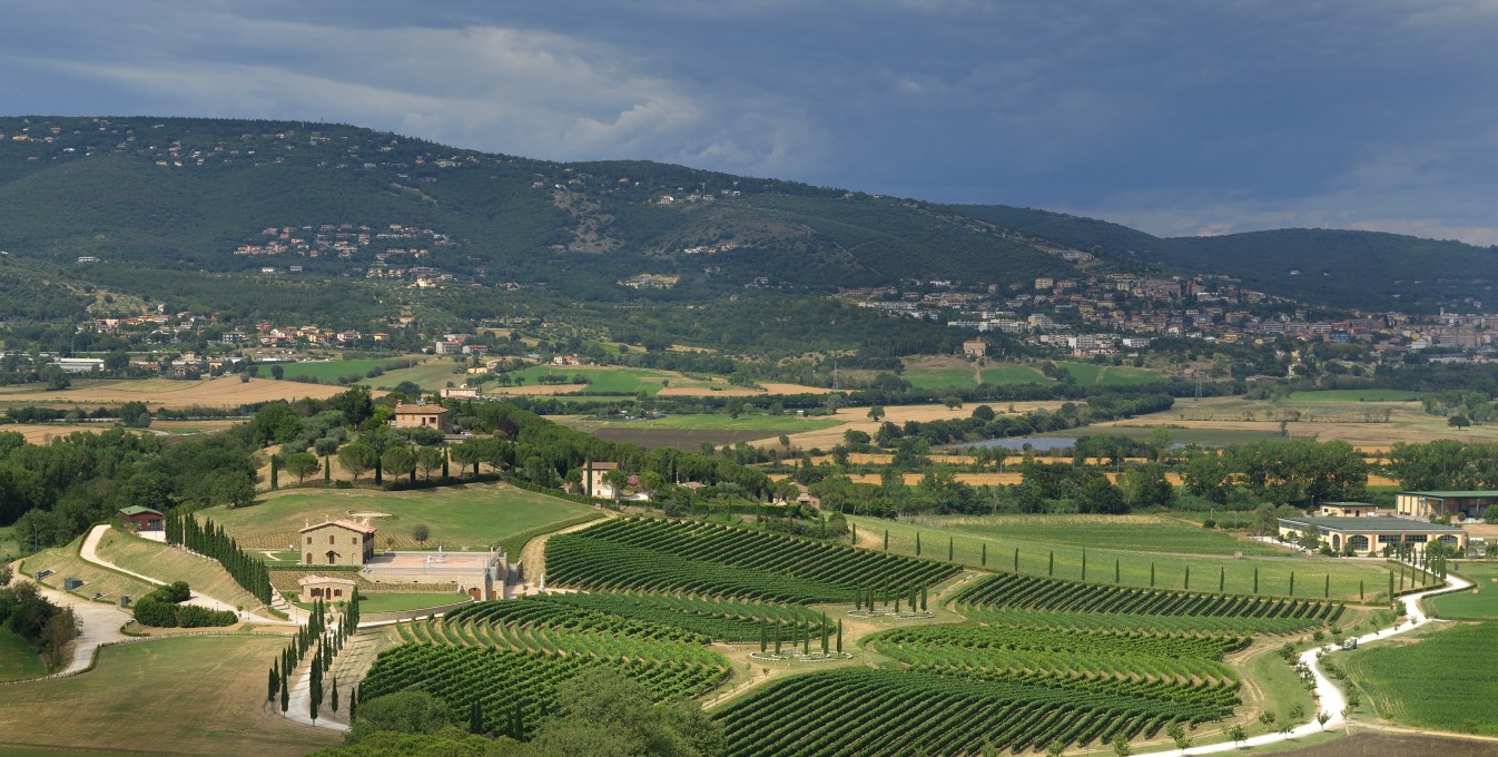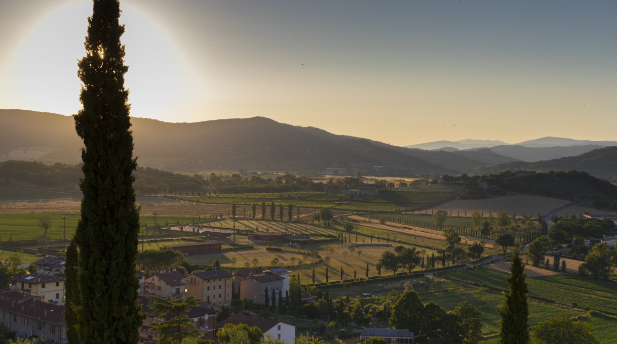 Simile ad una villa medicea, la Cantina di Solomeo è costruita sopra un basamento e domina il paesaggio circostante costituito dalla vigna, estesa e ordinata, e dai campi agricoli punteggiati di alberi da frutto.